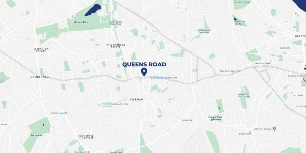 The Queens Road development occupies a prominent position on Queen’s Road, at the corner of Kender Street. It is situated between Queens Road (Peckham) and New Cross Gate stations (East London Line and National Rail from London Bridge), making it an excellent investment for its location and nearby transport links.